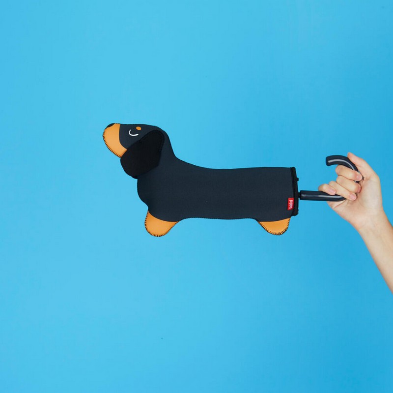 DESIGN ORIGINALE. L’ombrello presenta un motivo divertente con cani. La custodia è a forma di bassotto e il manico imita la coda dell’animale quando è chiuso.