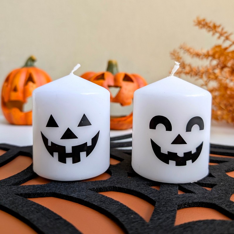 Candela di Halloween fantasma bianca con volto, non profumata, in 2 varianti assortite (spedite in base alla disponibilità)Durata: 15 oreDimensioni: 7.5 x 6 cm