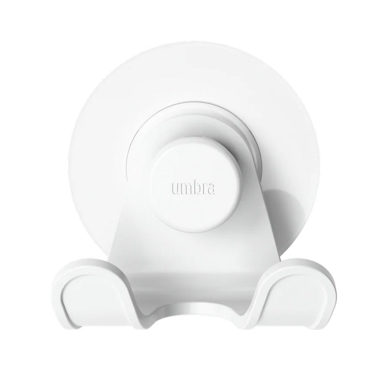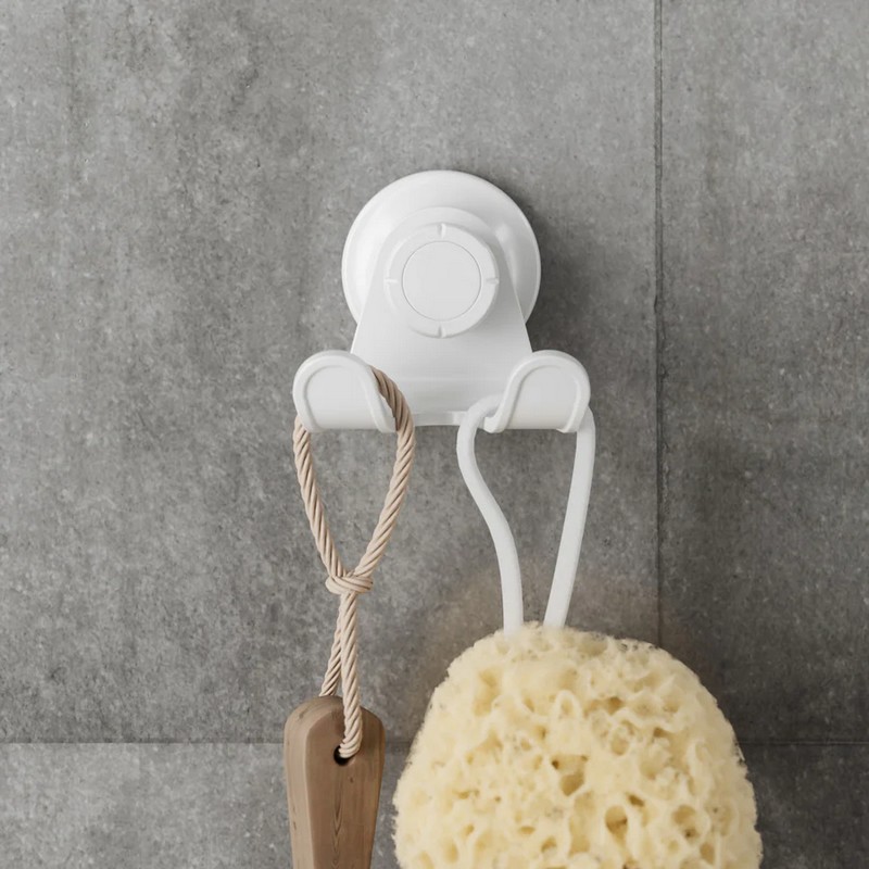 Gancio flessibile doppio di colore bianco, si può attaccare con la ventosa o gli adesivi inclusi
