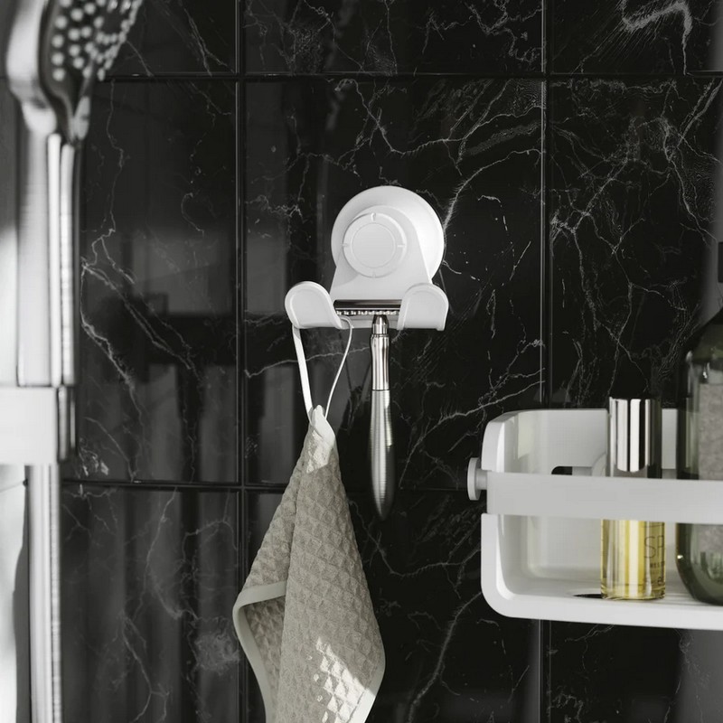 Tieni i tuoi articoli da bagno in alto e a portata di mano grazie al doppio gancio adesivo flessibile. Questo gancio è realizzato in plastica resistente, quindi è facile da pulire e non dovrai mai preoccuparti della ruggine. Facile da installare, il doppio gancio adesivo include delle strisce adesive impermeabili che possono essere applicate su diverse superfici, come piastrelle, cartongesso, cemento ecc. (non adatto alle superfici porose). Il doppio gancio adesivo è ottimo per le docce piccole con poco spazio per riporre gli oggetti. Un semplice gancio può davvero fare la differenza, consentendoti di tenere a portata di mano tutto ciò che ti serve in doccia. Pensato per appendere due spugne o piccoli asciugamani, oppure un rasoio, può essere utilizzato anche dall'altro lato del vetro doccia per appendere grandi asciugamani, un accappatoio, ecc. Realizzato per il 90% in plastica riciclata.