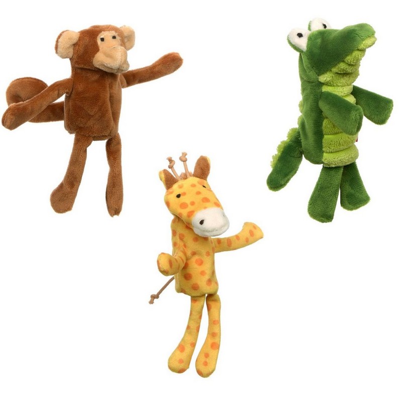 Set da 3 marionette da dito a tema animali della giungla (coccodrillo, scimmia e giraffa)