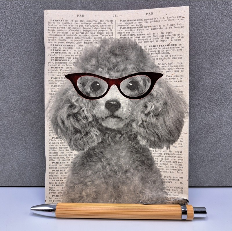 Quaderno decorato con cane con occhiali occhi di gatto in carta riciclata con penna nera effetto legno e pagine bianche