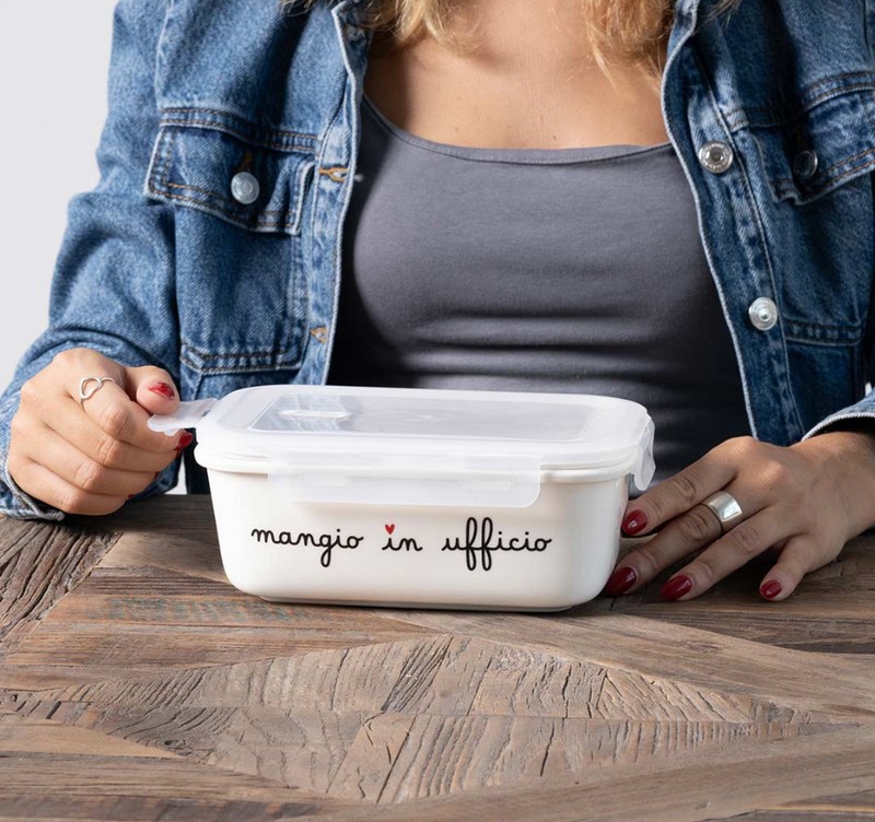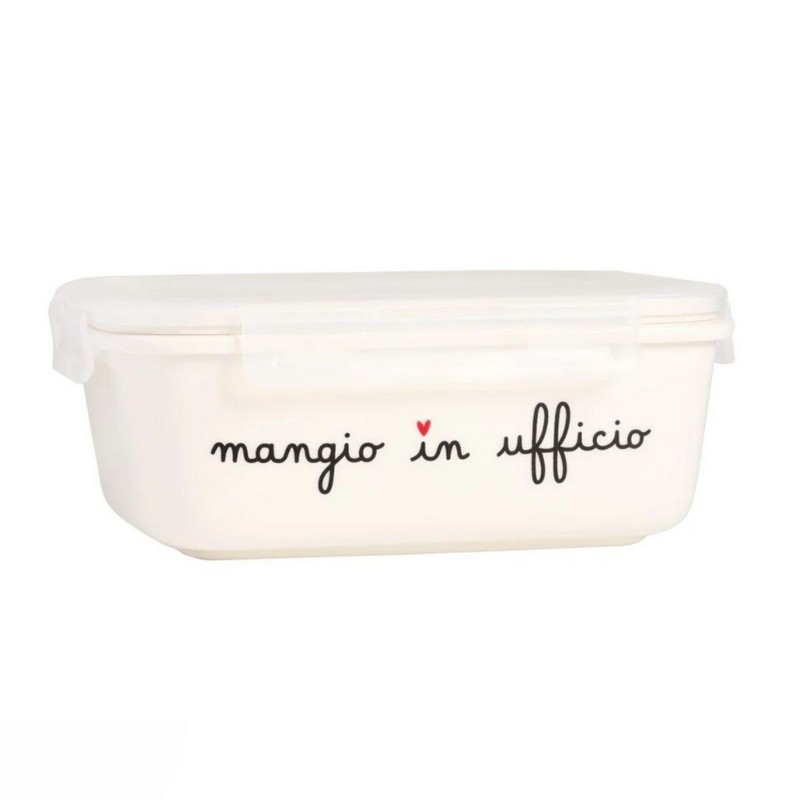 Contenitore per vivande grande bianco ermetico in gres decorato con scritta "Mangio in ufficio"