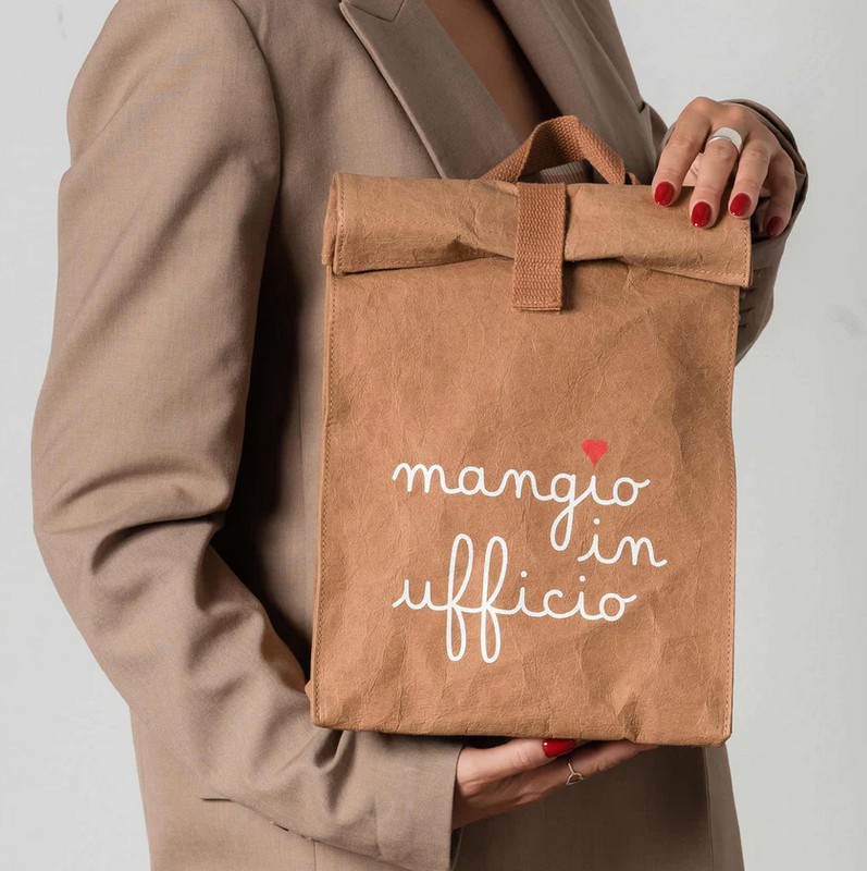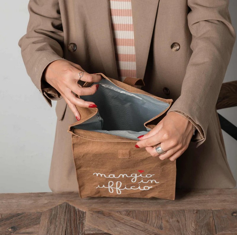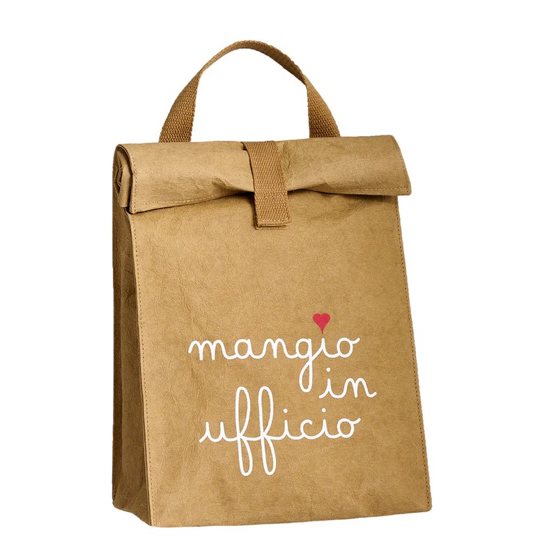 Portapranzo termico in fibra di cellulosa decorato con scritta "Mangio in ufficio"