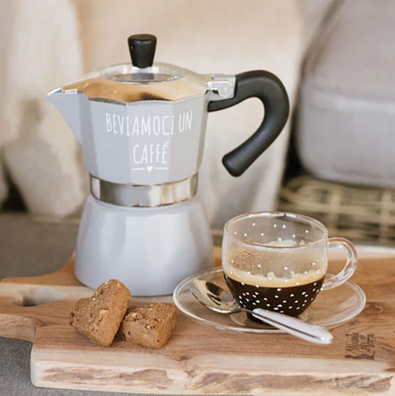 Moka 3 tazze grigia e cromata decorata con scritta “Beviamoci un caffè”, con sezione trasparente sul coperchio
