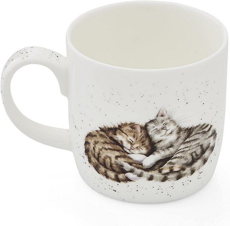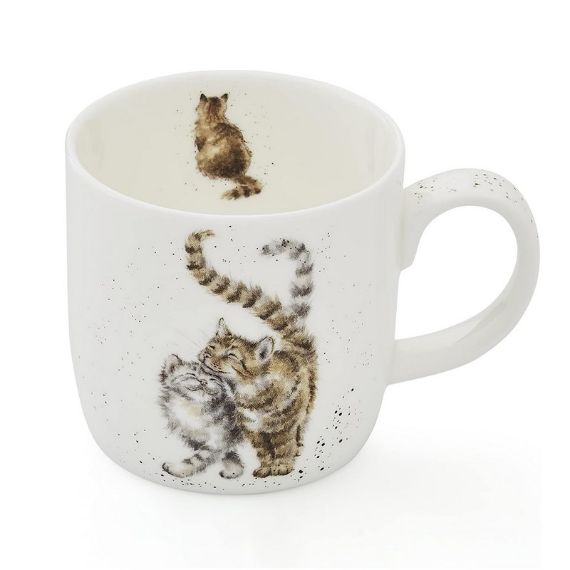Tazza mug con manico decorata con disegno doppio (fronte e retro, più dettagli interni e sul manico) con coppia di gattiDimensioni: 8.5 x 12 cmMateriale: fine bone chinaAdatta a lavastoviglie e microondeCapacità: 310 ml