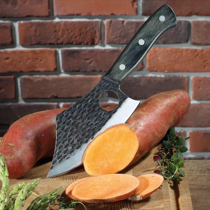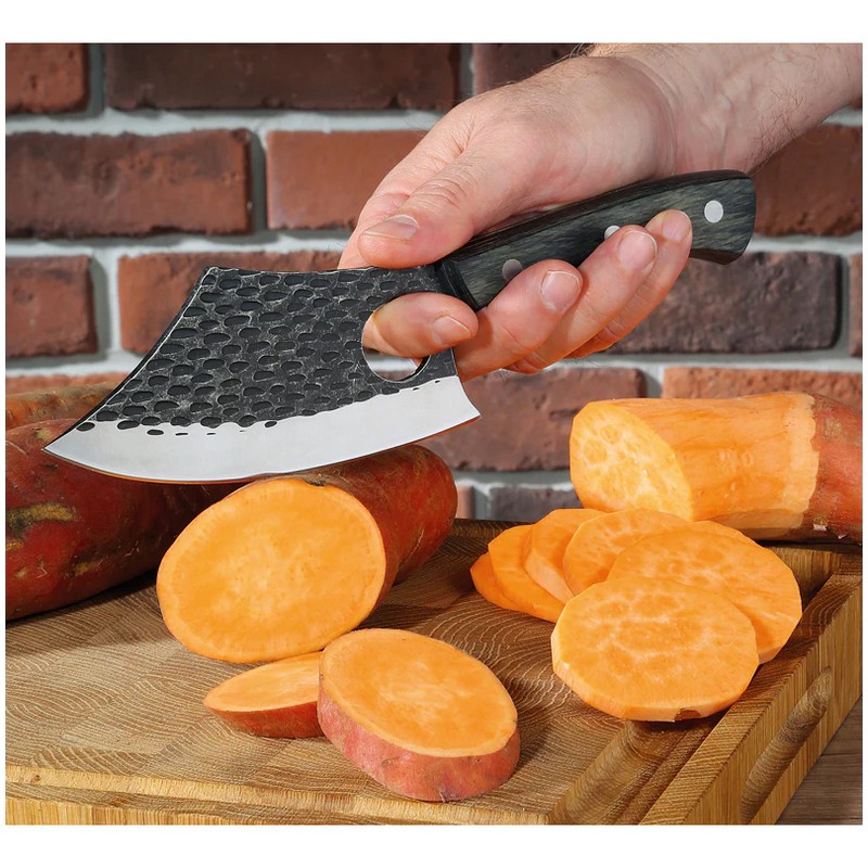 Il coltello robusto, forgiato a mano in acciaio speciale 420J2, garantisce un utilizzo sicuro e preciso. Il manico curvo in legno di pakka e il foro nella lama permettono totale controllo e perfetto equilibrio nel maneggiare col coltello. Il compagno ideale per cucina, campeggio e altre attività all'aperto.