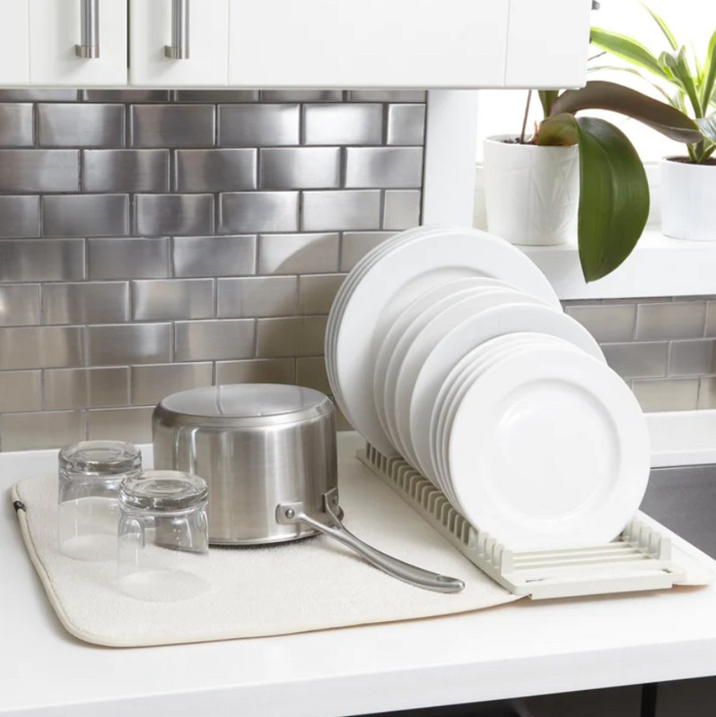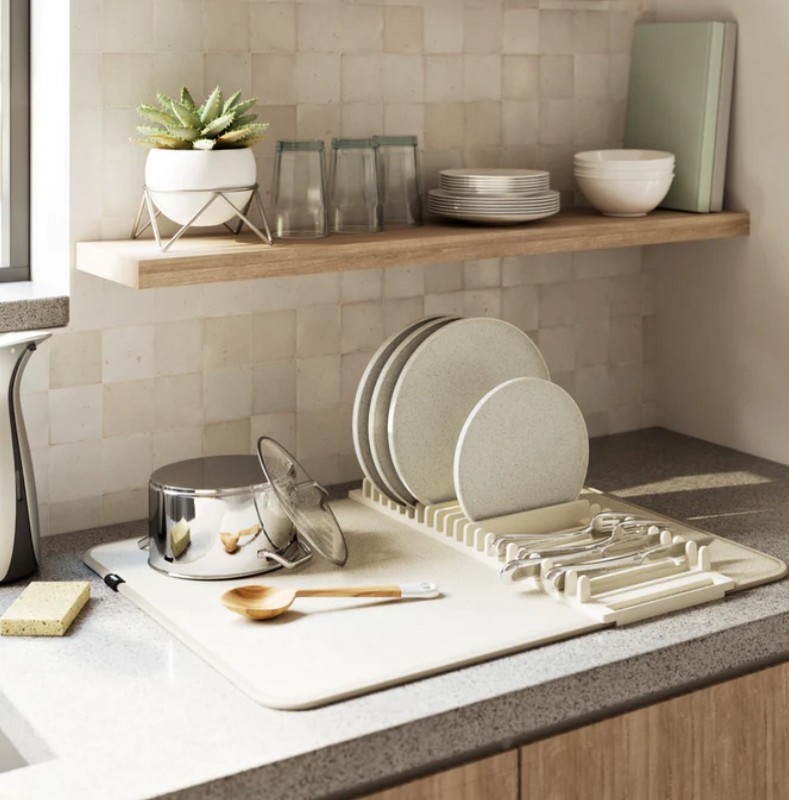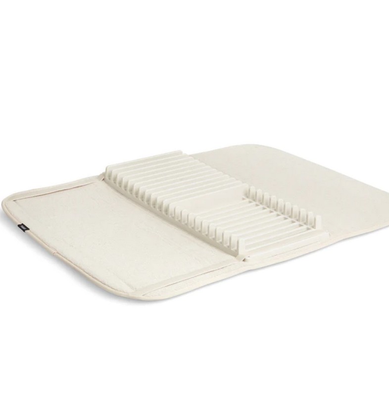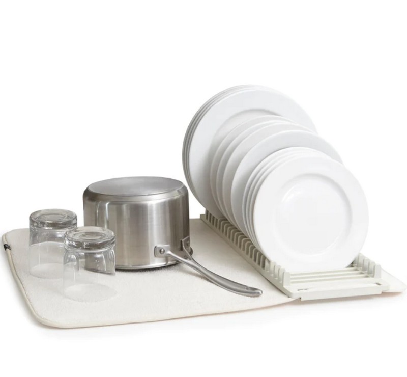 Scolapiatti pieghevole con tappetino assorbente in microfibra color beige, un utilissimo regalo uomo e donna
