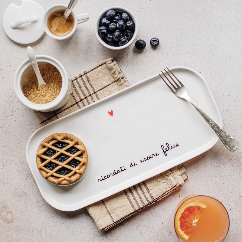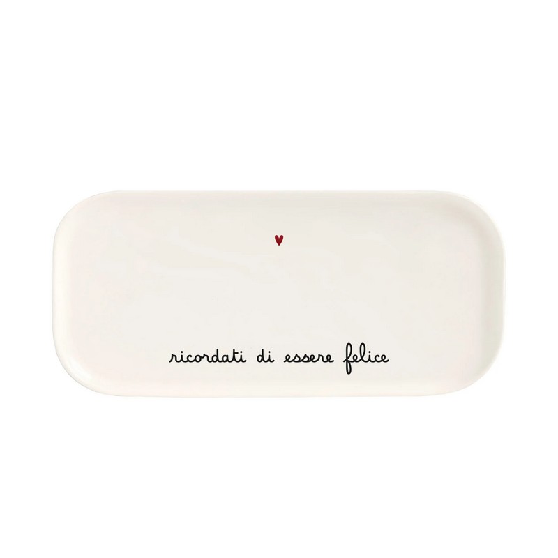 Piatto rettangolare in gres bianco decorato con scritta “Ricordati di essere felice” e cuore, utilizzabile anche come vassoio