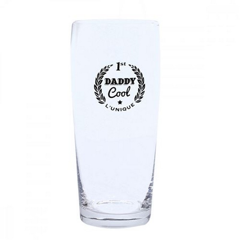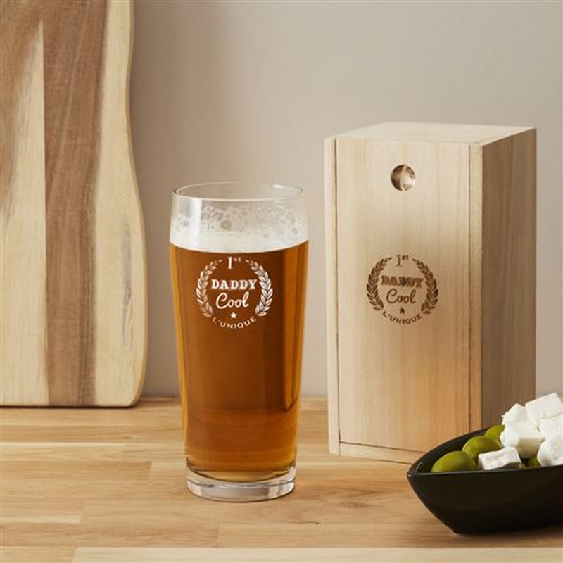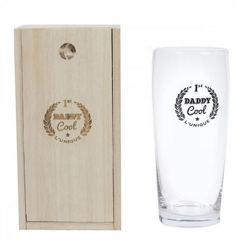 Bicchiere per birra con scritta "Daddy Cool" con contenitore in legno