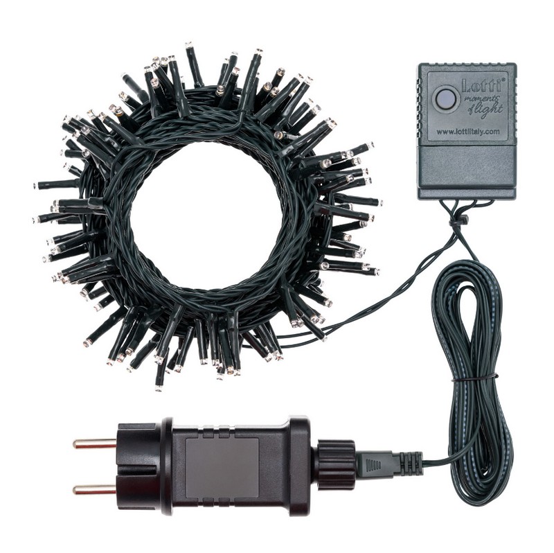 Catena lineare TLG 180 MiniLED BIANCO CALDO Ø3mm Reflex, timer memory controller 8 giochi di luce selezionabili con timer on-off 8-16 ore disinseribile tramite pulsante luminoso, uso esterno, cavo verde, dimensioni 4+13,1m