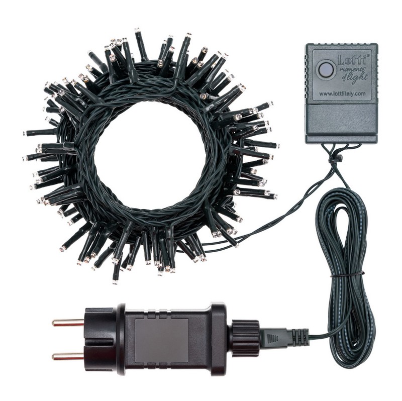 Catena lineare TLG 360 MiniLED BIANCO CALDO Ø3mm Reflex, timer memory controller 8 giochi di luce selezionabili con timer on-off 8-16 ore disinseribile tramite pulsante luminoso, uso esterno, cavo verde, dimensioni 4+25,7m