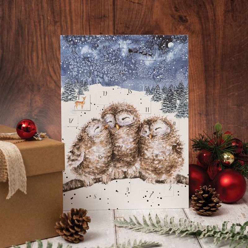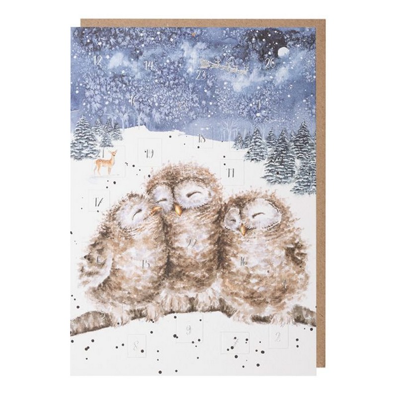 Biglietto-calendario dell'avvento decorato con tre gufi su un ramo in un paesaggio innevato