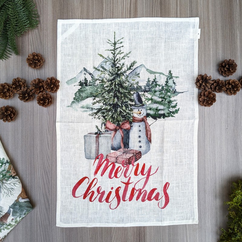 Strofinaccio asciugapiatti in lino decorato con pupazzo di neve e scritta Merry Christmas