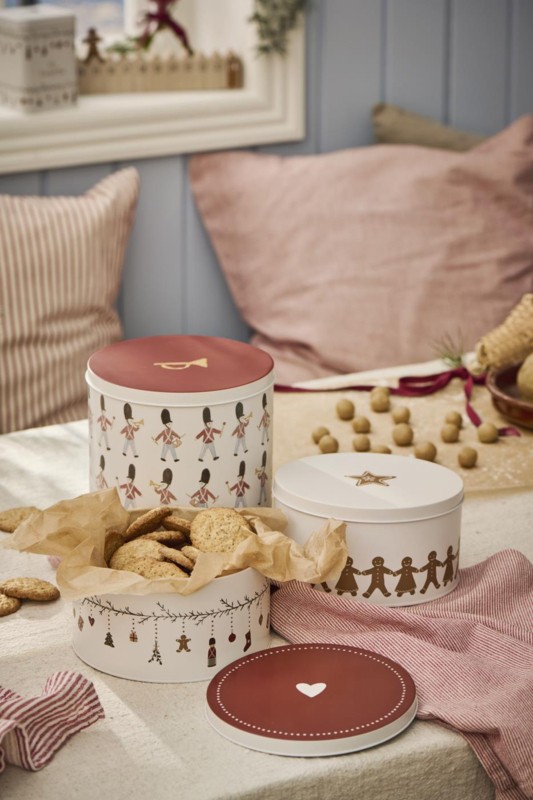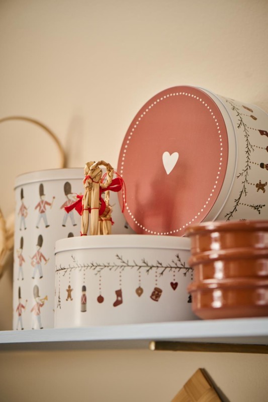Barattolo da cucina natalizio in latta tondo decorato con ghirlanda e cuore sul coperchio