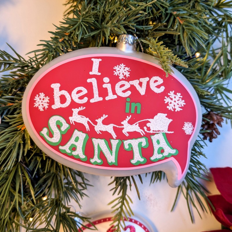 Pallina natalizia decorata a forma di fumetto con scritta I BELIEVE IN SANTA (Io credo in Babbo Natale)