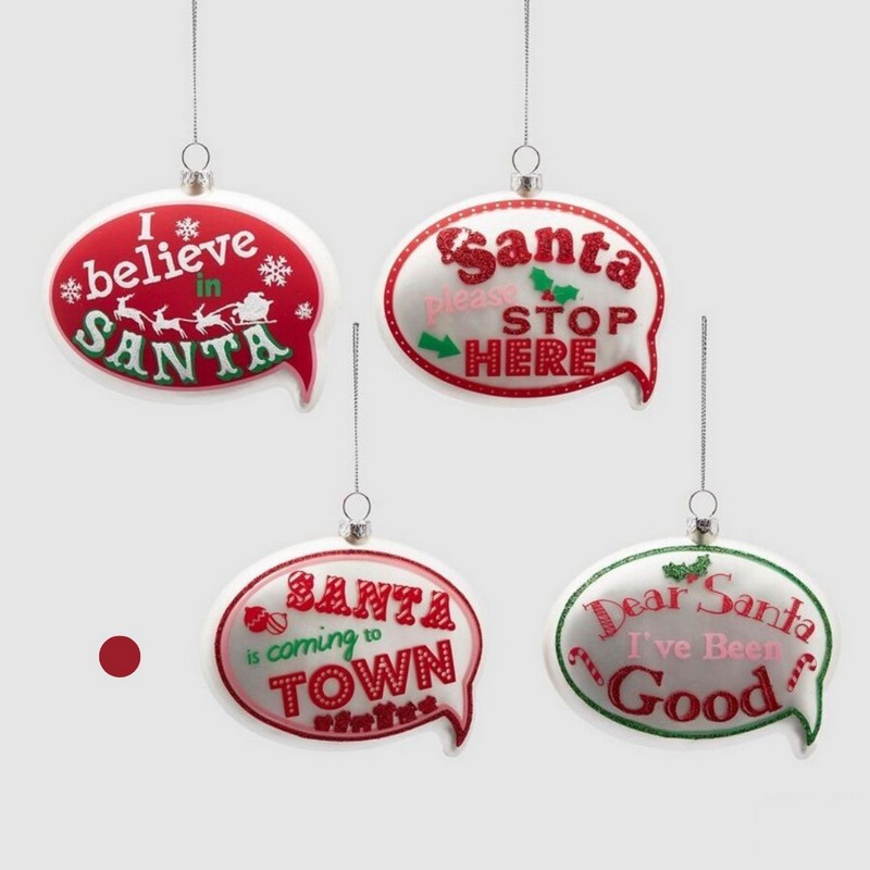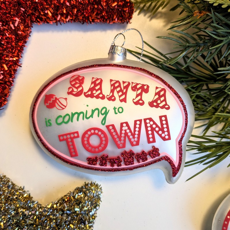 Pallina natalizia decorata a forma di fumetto con scritta SANTA IS COMING TO TOWN (Babbo Natale sta arrivando in città)