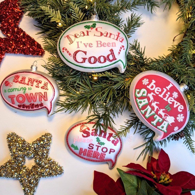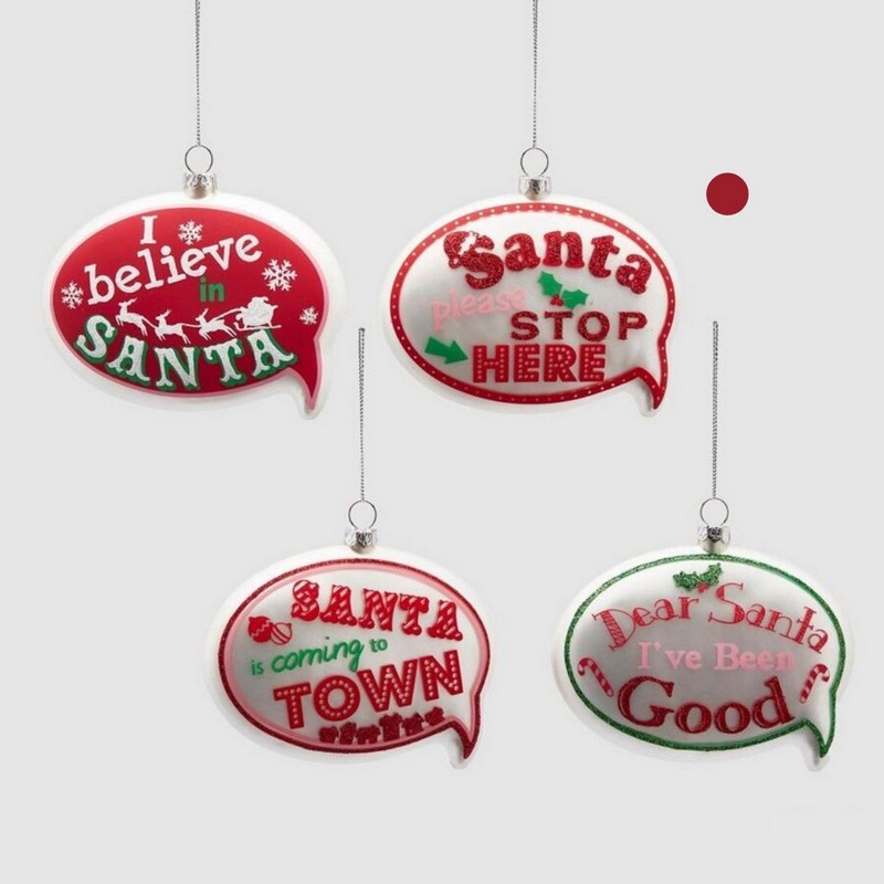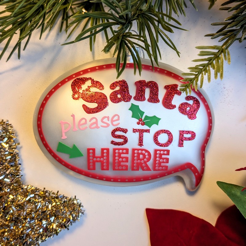 Pallina natalizia decorata a forma di fumetto con scritta SANTA PLEASE STOP HERE (Babbo Natale per favore fermati qui)