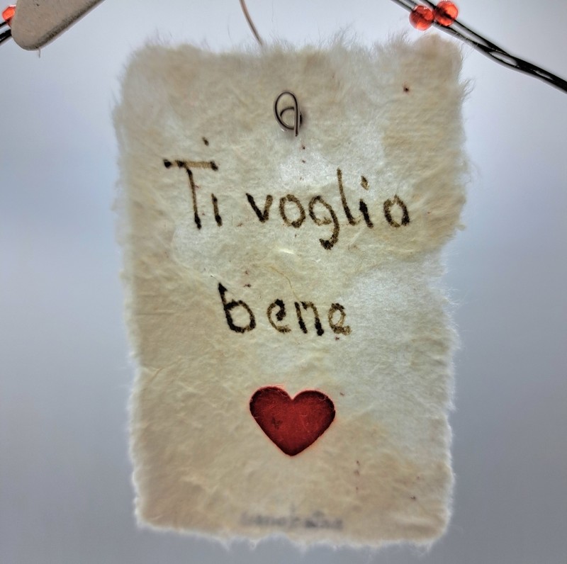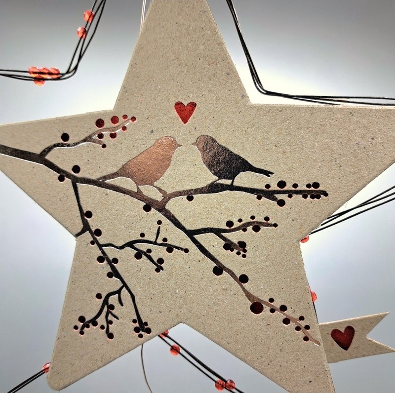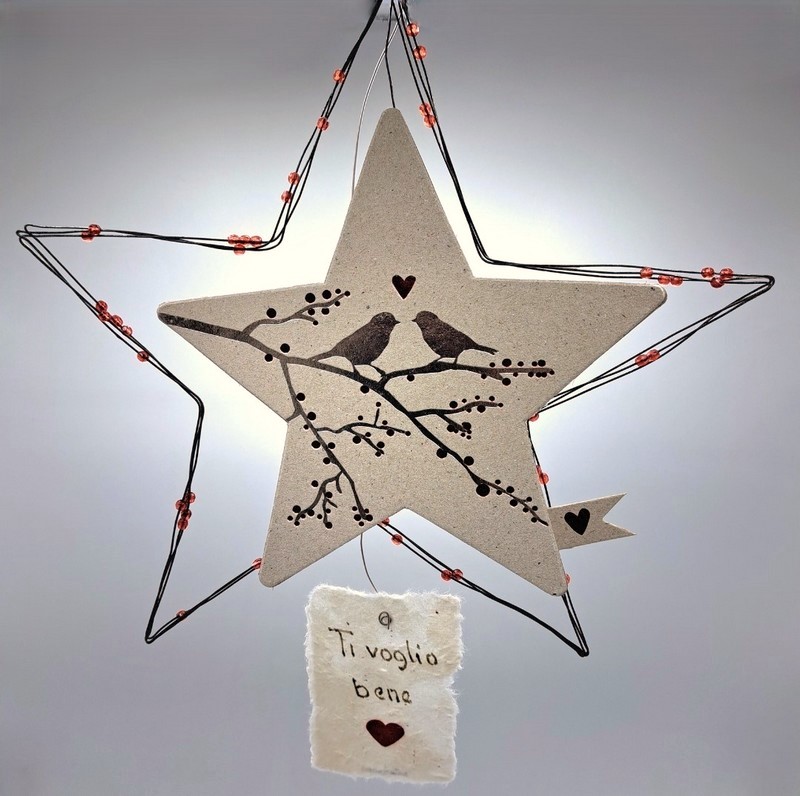 Stella in metallo da appendere decorata con bacche e uccellini con biglietto con scritta “Ti voglio bene”Materiali: metallo e cartaDimensioni: 27 x 27 cm