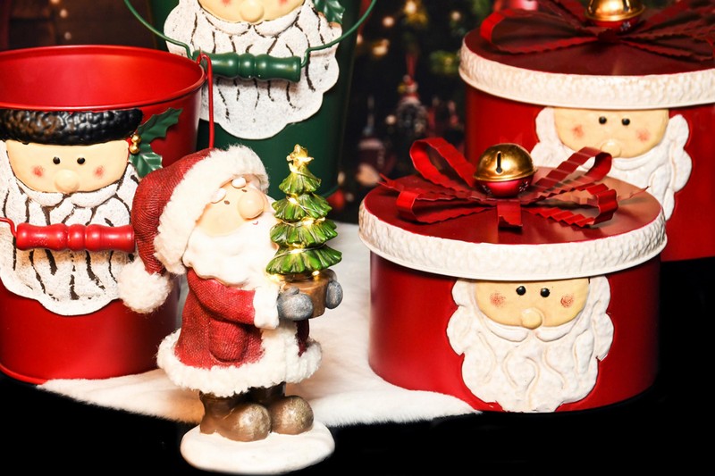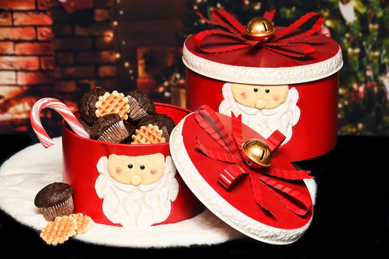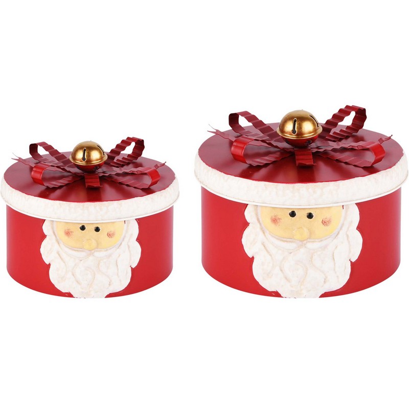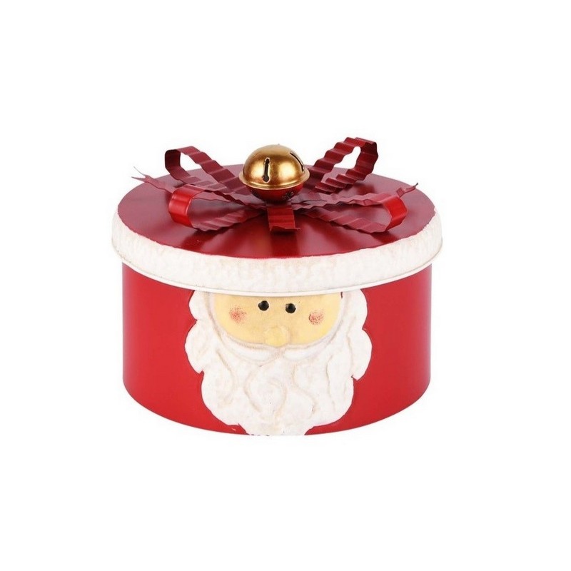 Scatola natalizia in latta rossa decorata faccia di Babbo Natale, fiocco e sonaglio