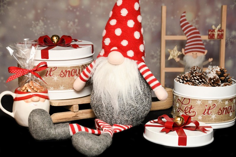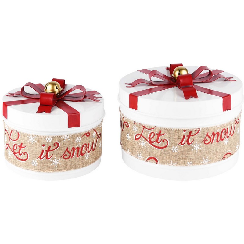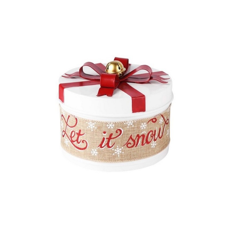 Scatola natalizia in latta bianca decorata con scritta "Let it snow" e fiocco