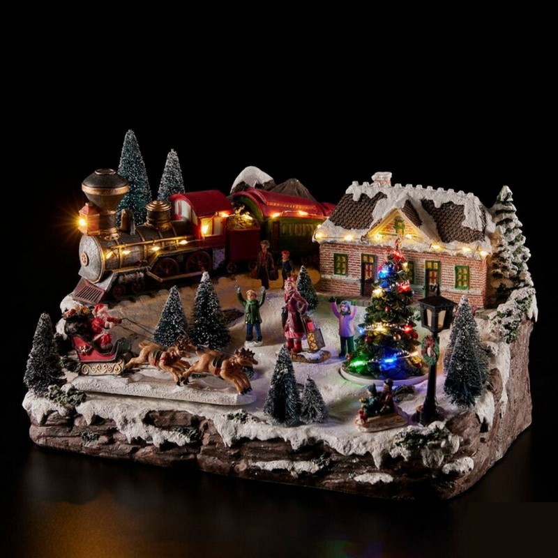 Villaggio natalizio con stazione dei treni, alberi e personaggi, illuminato con luci LED.Dimensioni: 24 x 38 x 27 cm