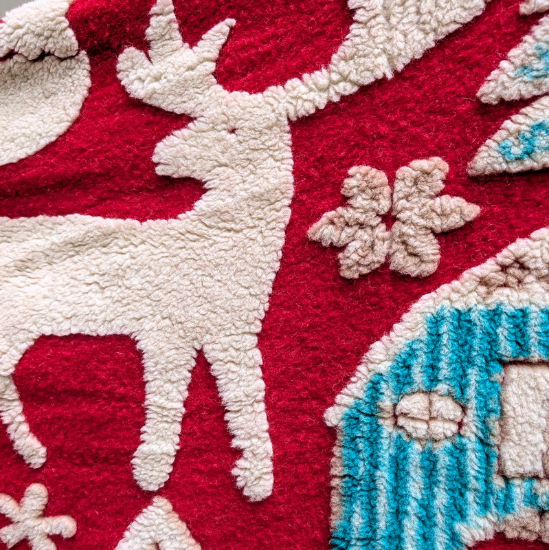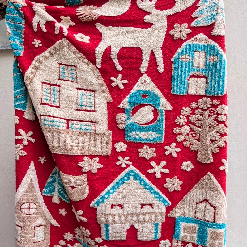 Coperta in lana cotta 150 x 200 cm con decoro paesaggio natalizio su fondo rosso, fatta in Italia con lana italiana ecosostenibile e lavabile in lavatrice - una calda coperta matrimoniale di lana per letto o divano perfetta come idea regalo di Natale