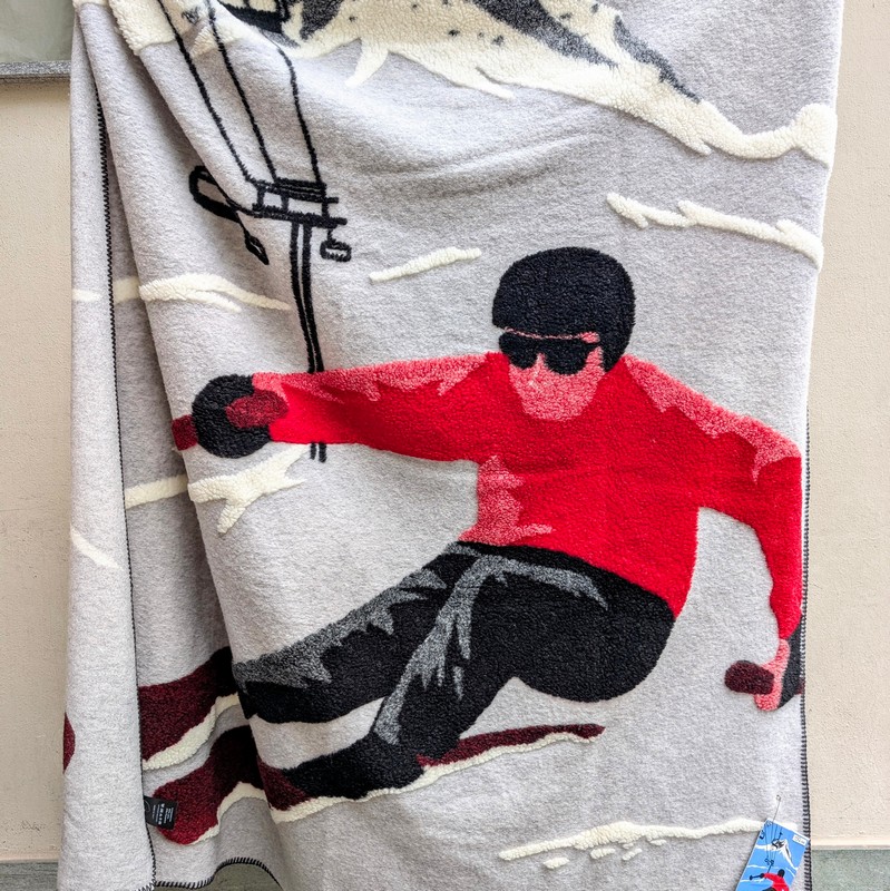 Coperta in lana cotta 150 x 200 cm decorata con sciatore in paesaggio montano su fondo grigio perla, fatta in Italia con lana italiana ecosostenibile e lavabile in lavatrice - una calda coperta matrimoniale di lana per letto o divano perfetta come idea regalo di Natale