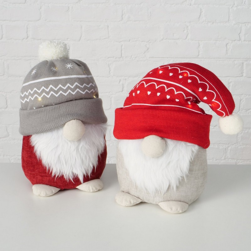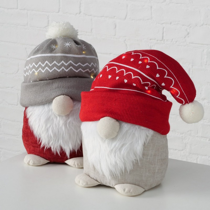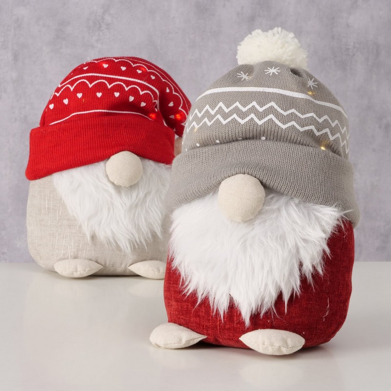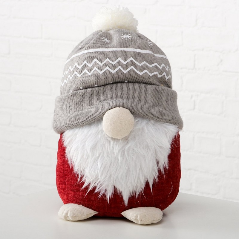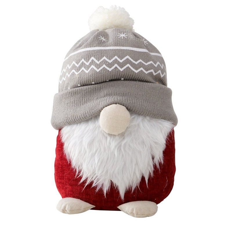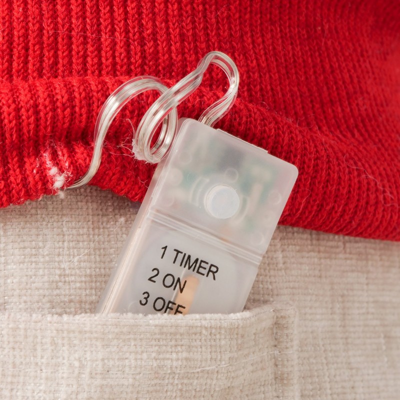 Fermaporta morbido a forma di Babbo Natale con cappello grigio con luci con opzione timerBatterie luci: una pila a bottone di tipo 2016Materiali: lino, poliacrilico, poliestereDimensioni: 30 x 16 x 24 cm
