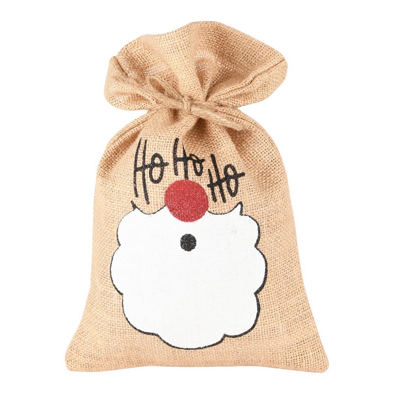Sacco richiudibile per regali di Natale in juta beige raffigurante Babbo Natale con scritta “Ho Ho Ho”