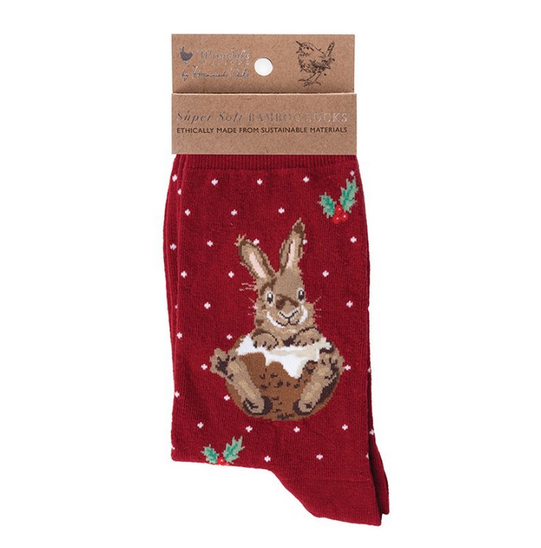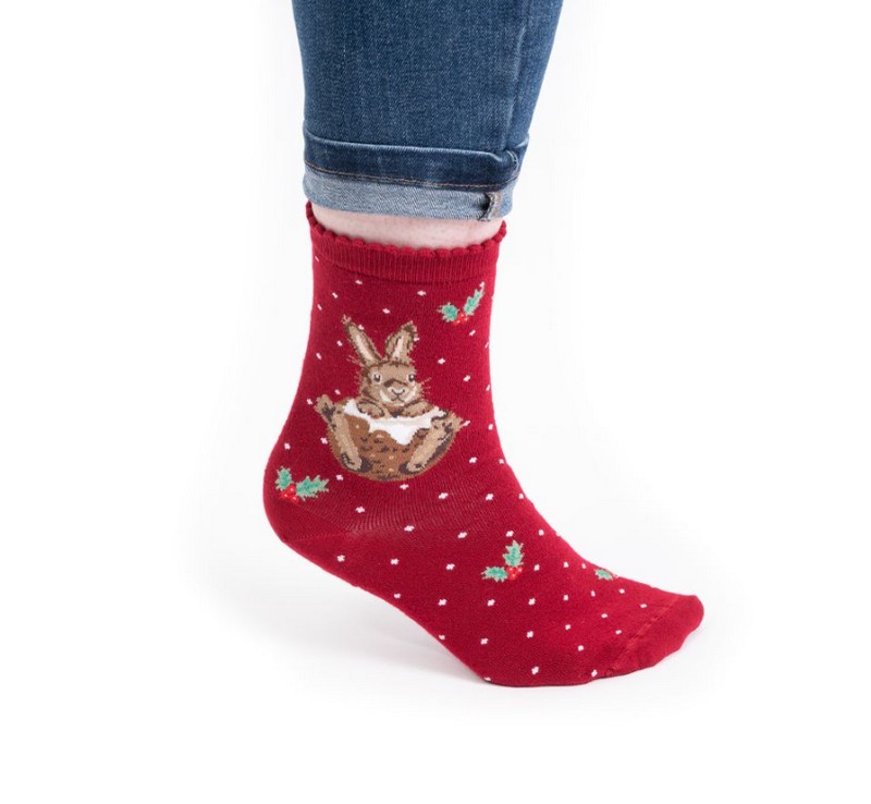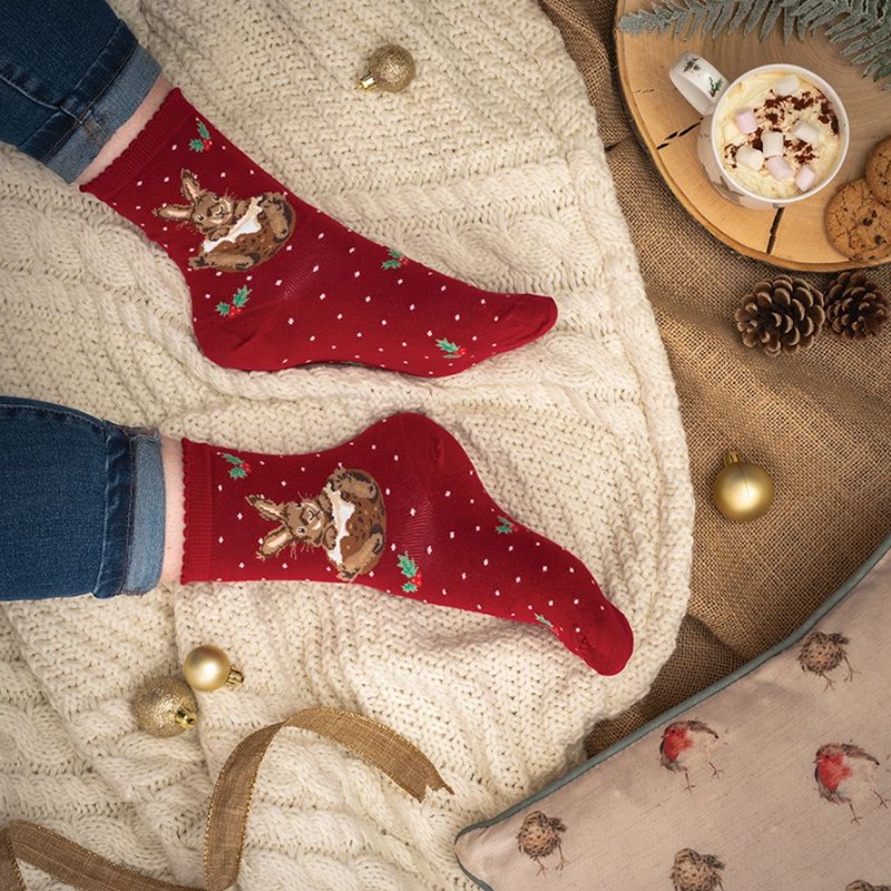 Calze natalizie da donna decorate con un coniglio su sfondo rosso con agrifogli