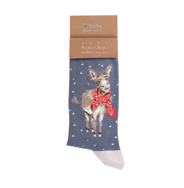 Calze natalizie da uomo decorate con un asino con sciarpa su sfondo grigio scuro innevato